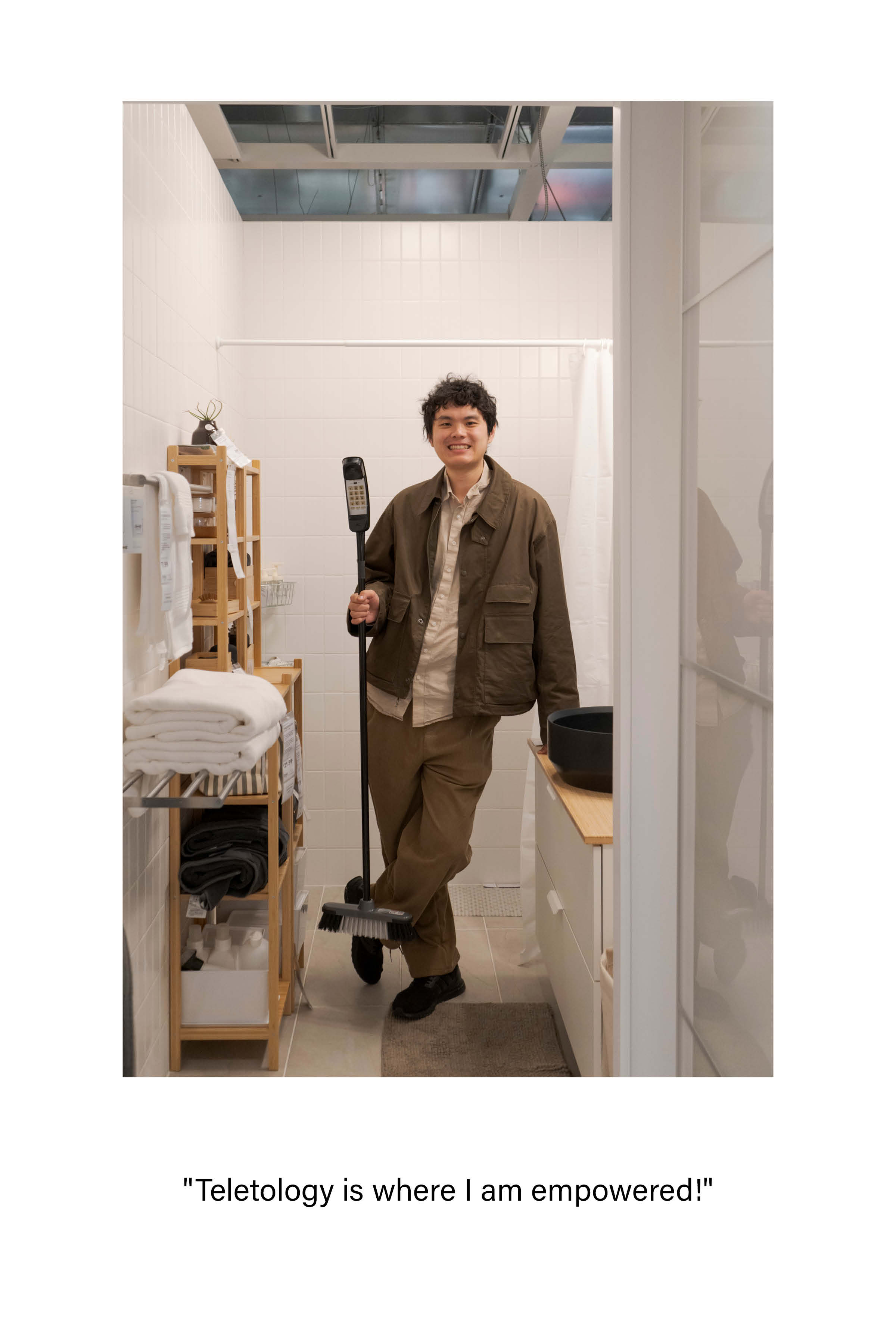 "Teletology" is a set of practices centered around the essence of the telephone. The "Telebroom" is the first created object, symbolizing the labor of housewives. By venerating the Telebroom, people will develop a deeper appreciation for the role of housewives. Having the Telebroom at home is envisioned to empower individuals with the virtues of housewives.